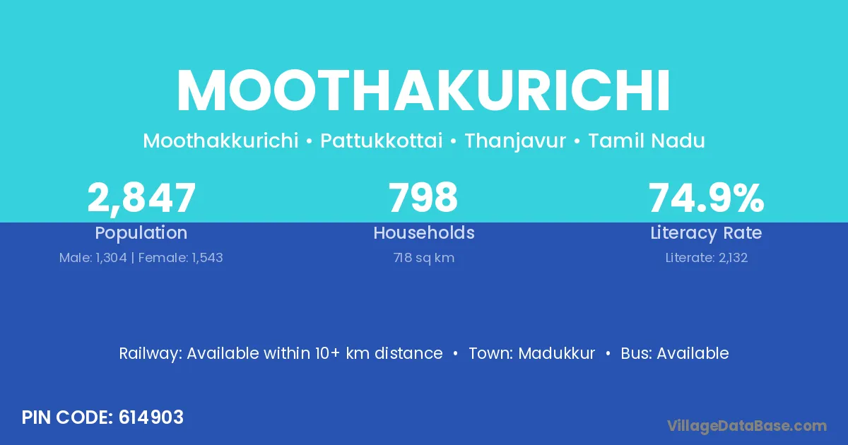 Moothakurichi village has a total population of 2,847 people, of which 1,304 are males and 1,543 are females.
