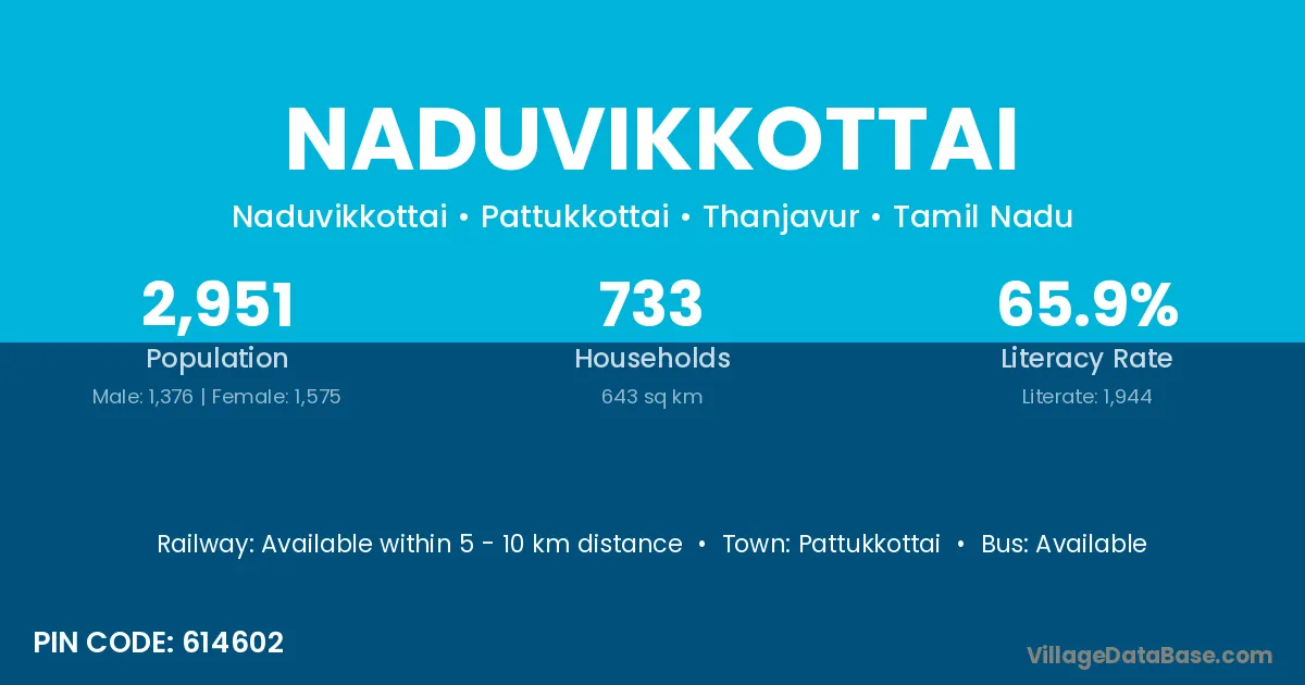 Naduvikkottai village has a total population of 2,951 people, of which 1,376 are males and 1,575 are females.