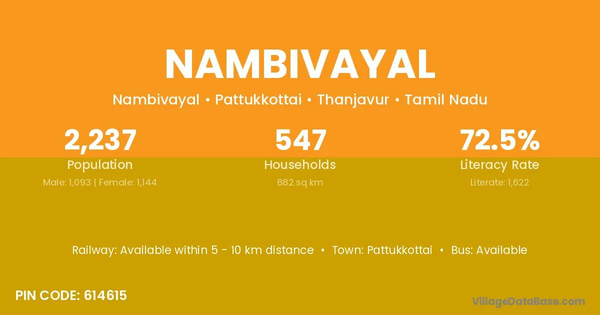Nambivayal village has a total population of 2,237 people, of which 1,093 are males and 1,144 are females.