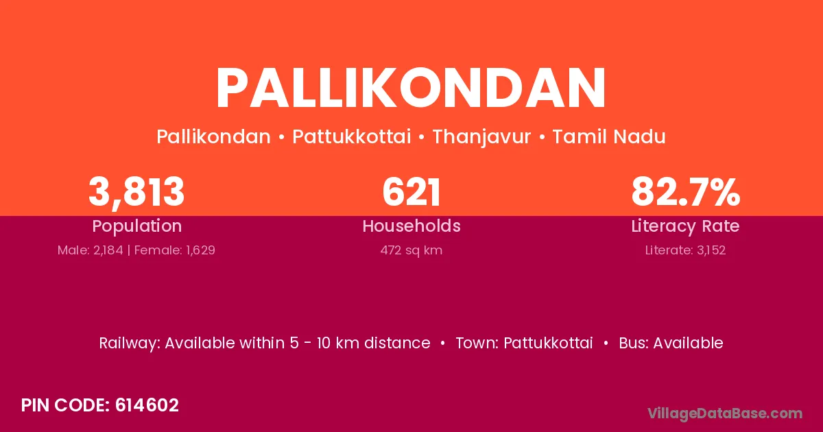 Pallikondan village has a total population of 3,813 people, of which 2,184 are males and 1,629 are females.