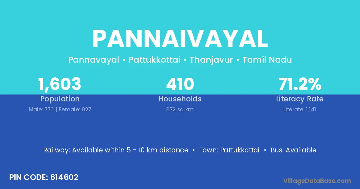 Pannaivayal village has a total population of 1,603 people, of which 776 are males and 827 are females.
