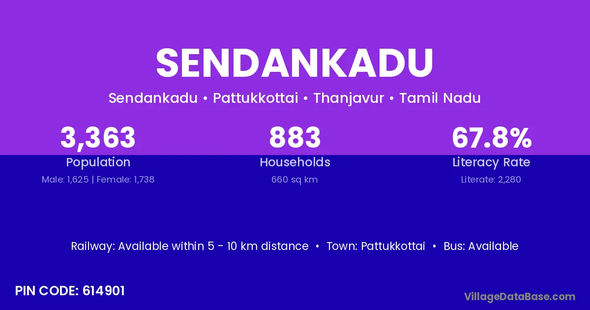 Sendankadu village has a total population of 3,363 people, of which 1,625 are males and 1,738 are females.