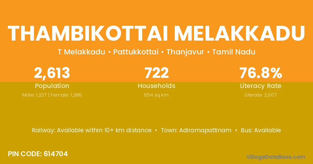 Thambikottai Melakkadu village has a total population of 2,613 people, of which 1,227 are males and 1,386 are females.