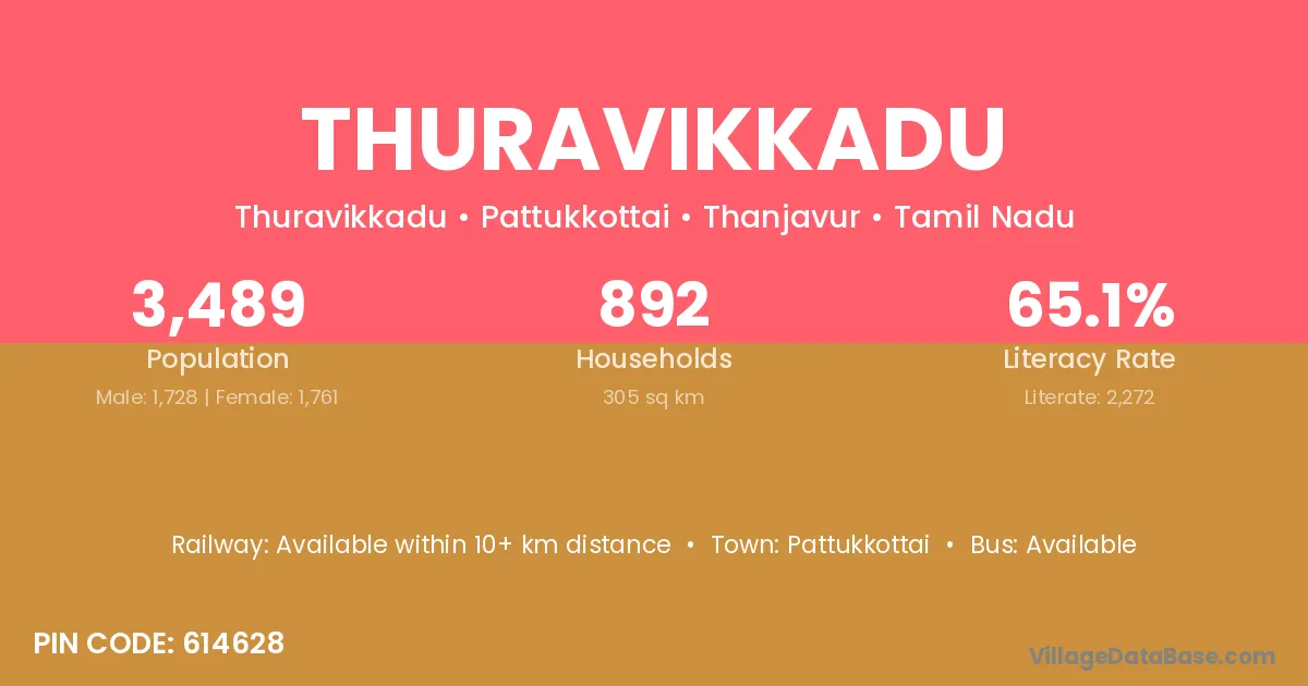 Thuravikkadu village has a total population of 3,489 people, of which 1,728 are males and 1,761 are females.