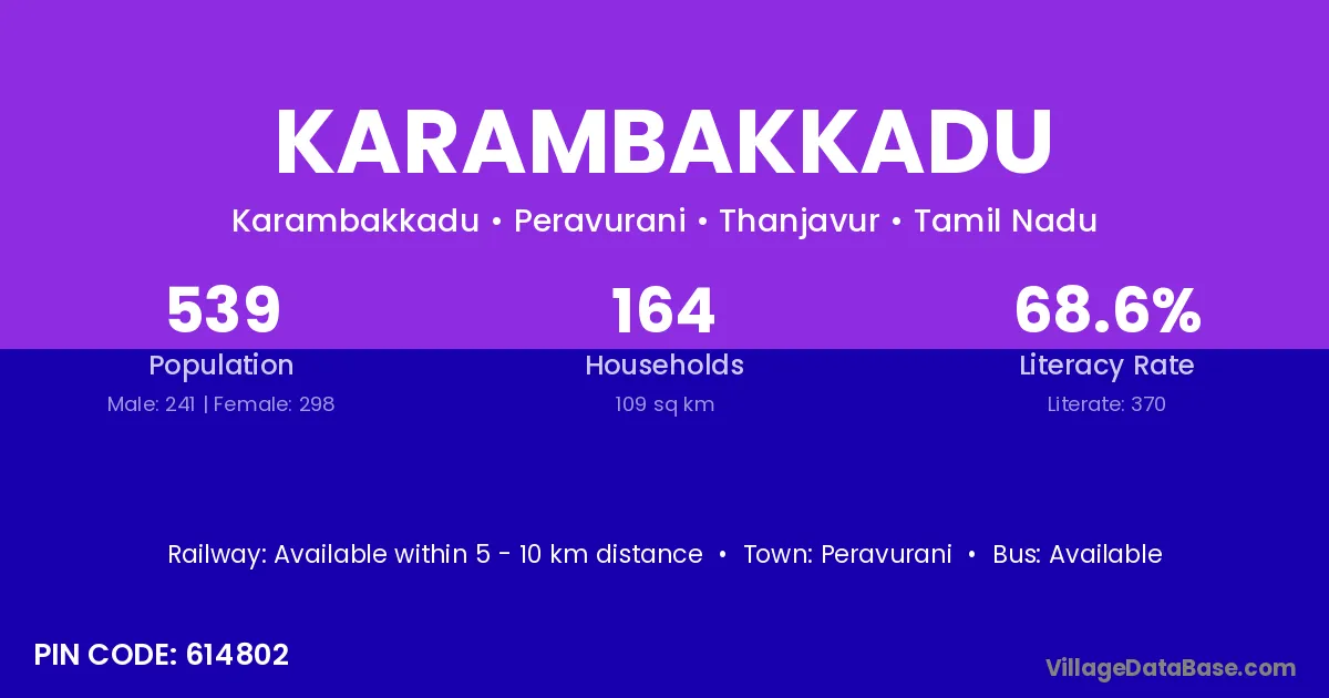 Karambakkadu village has a total population of 539 people, of which 241 are males and 298 are females.