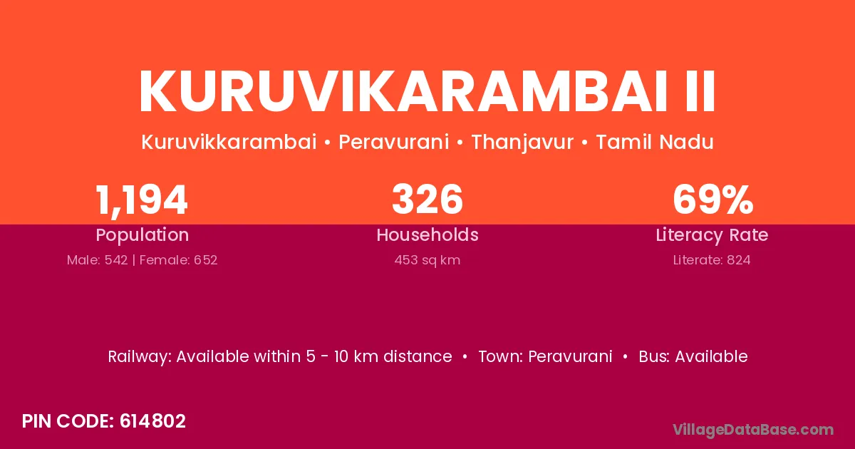 Kuruvikarambai Ii village has a total population of 1,194 people, of which 542 are males and 652 are females.