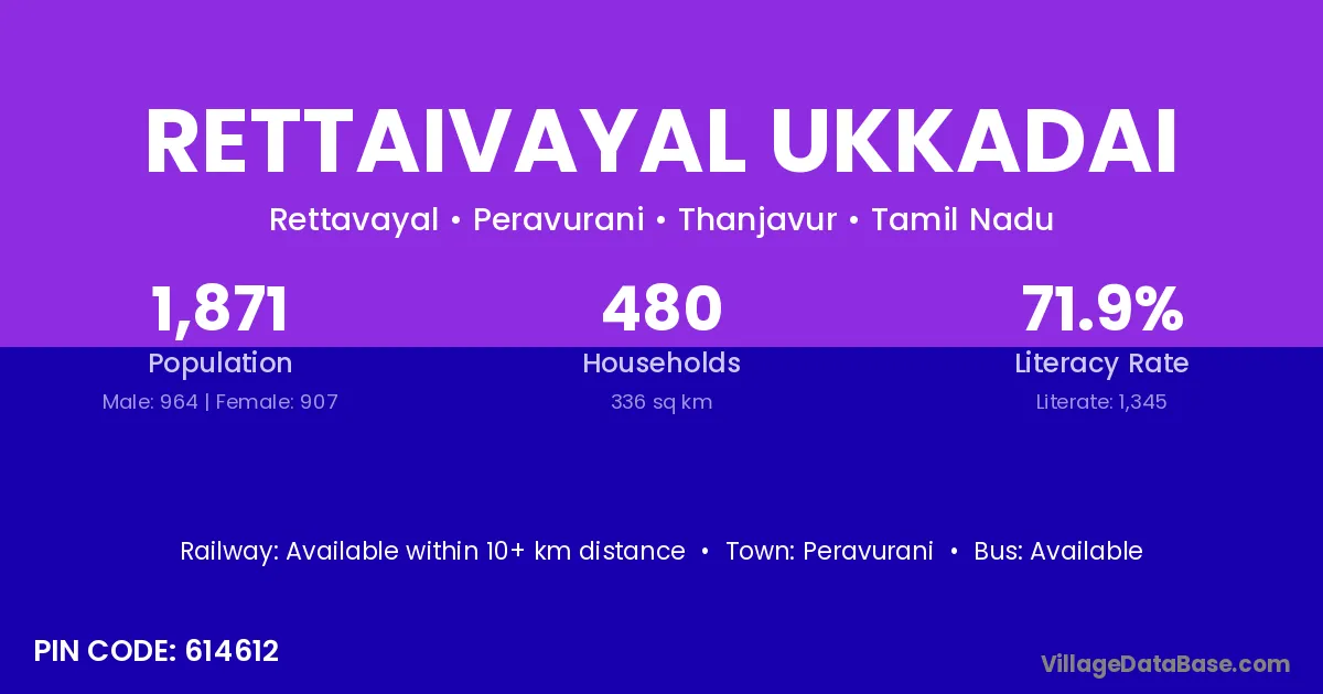 Rettaivayal Ukkadai village has a total population of 1,871 people, of which 964 are males and 907 are females.