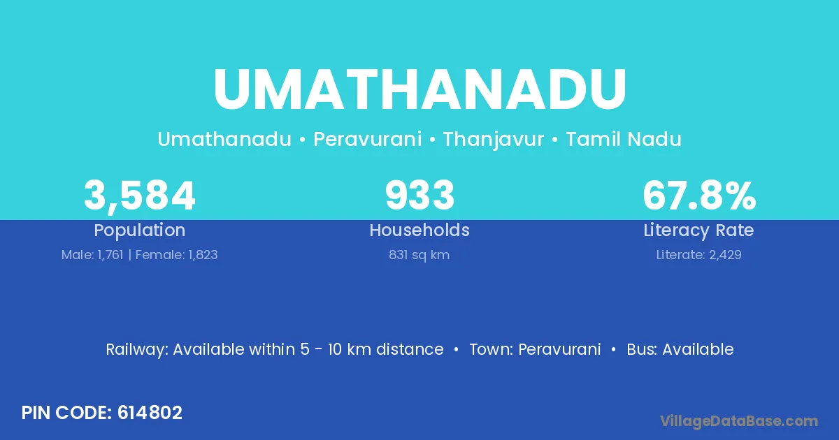 Umathanadu village has a total population of 3,584 people, of which 1,761 are males and 1,823 are females.