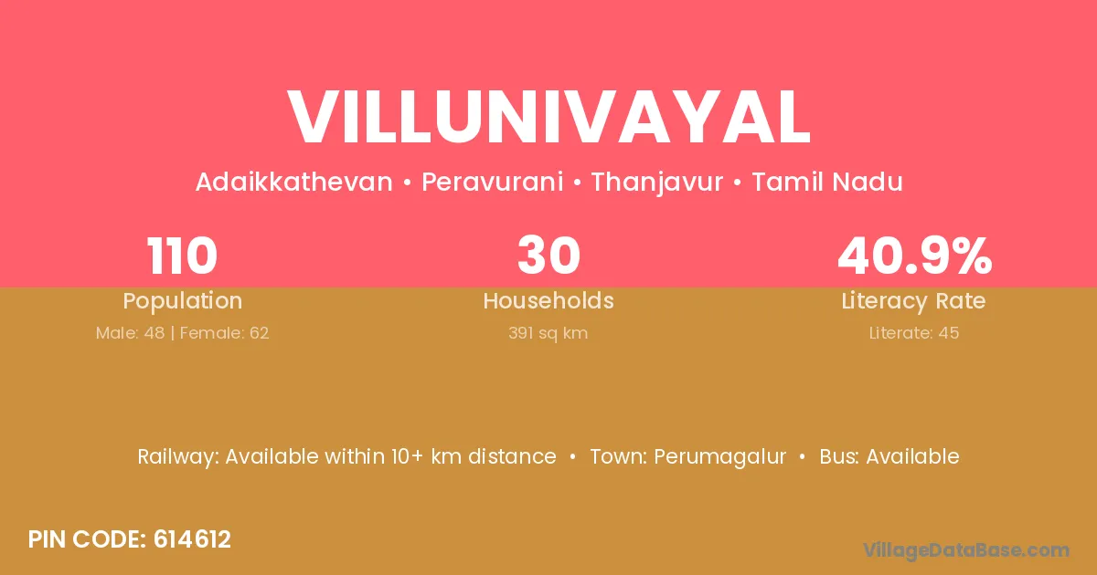 Villunivayal village has a total population of 110 people, of which 48 are males and 62 are females.