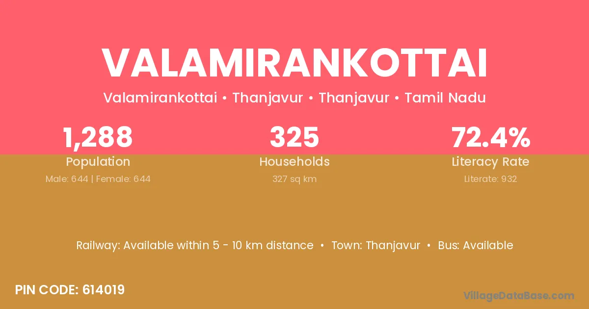 Valamirankottai village has a total population of 1,288 people, of which 644 are males and 644 are females.