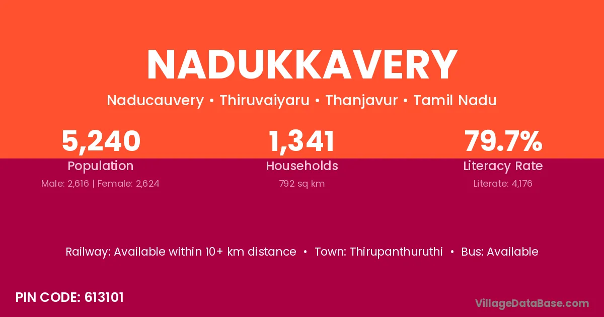 Nadukkavery village has a total population of 5,240 people, of which 2,616 are males and 2,624 are females.