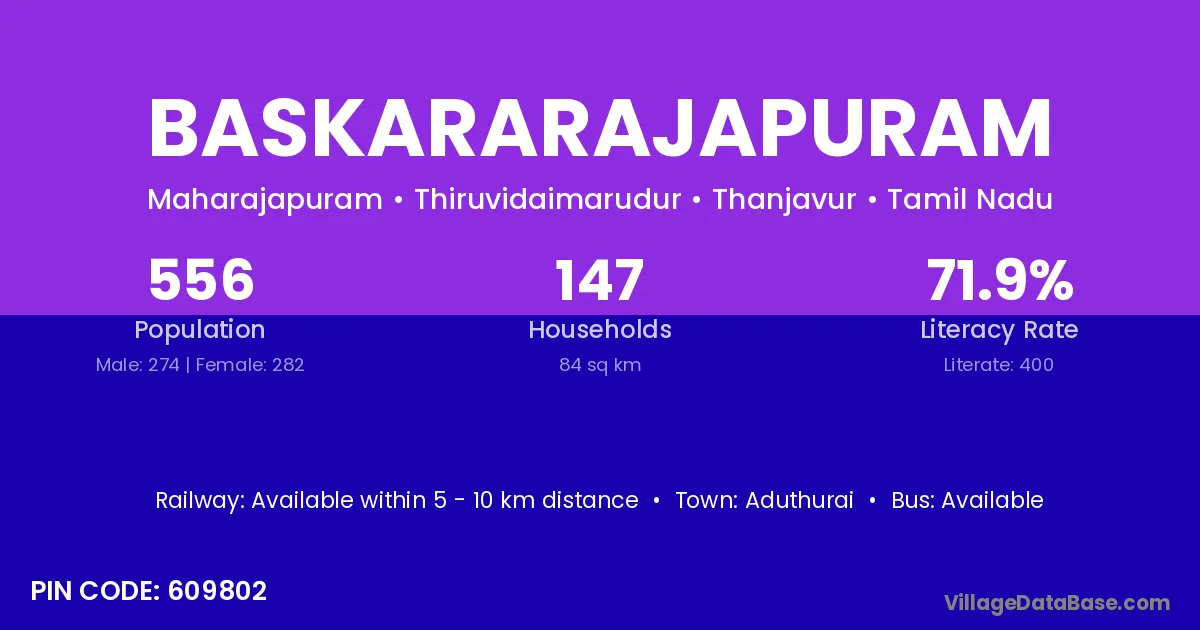 Baskararajapuram village has a total population of 556 people, of which 274 are males and 282 are females.