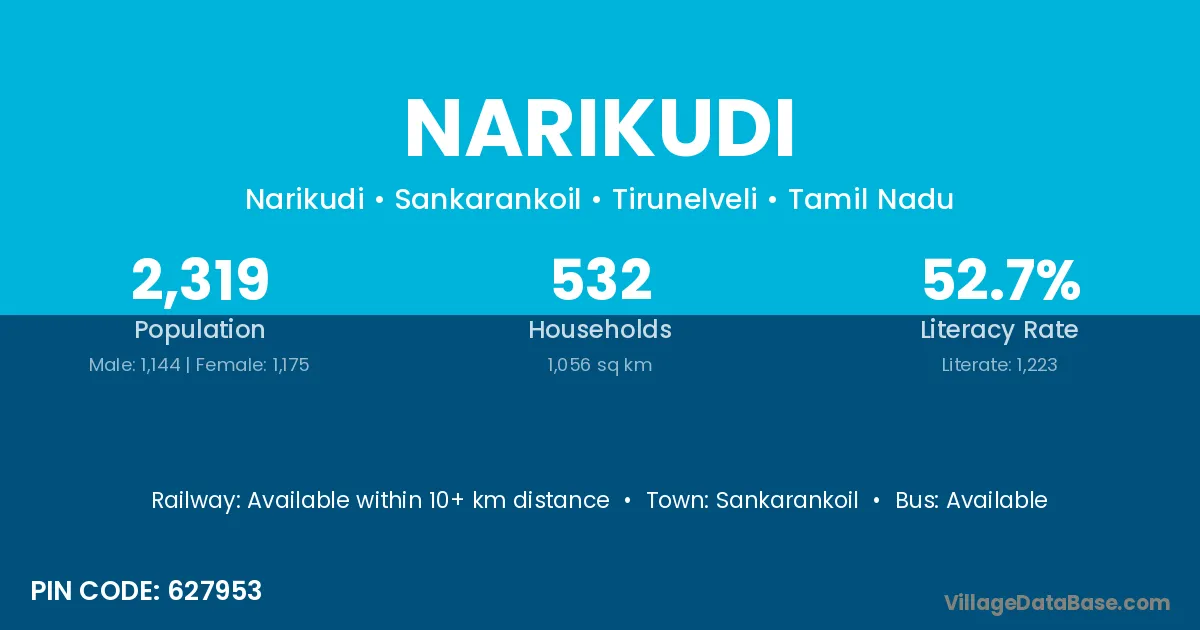 The literacy rate of Narikudi village is 72.02%. Male literacy stands at 78.04% and female literacy at 66.06%.