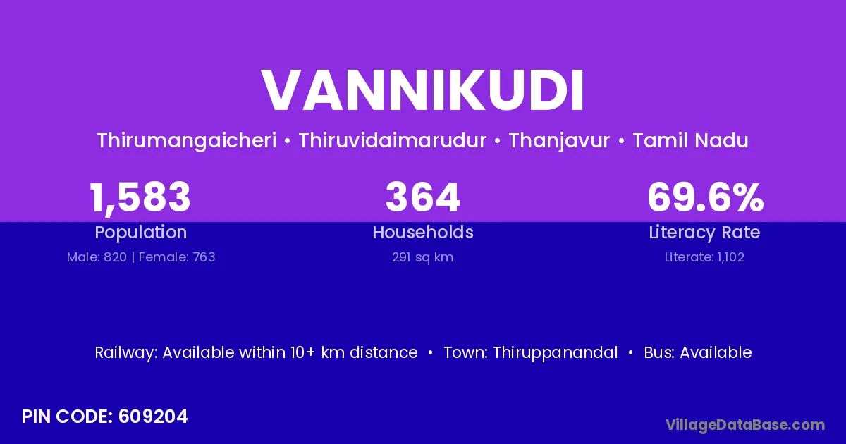 Vannikudi village has a total population of 1,583 people, of which 820 are males and 763 are females.