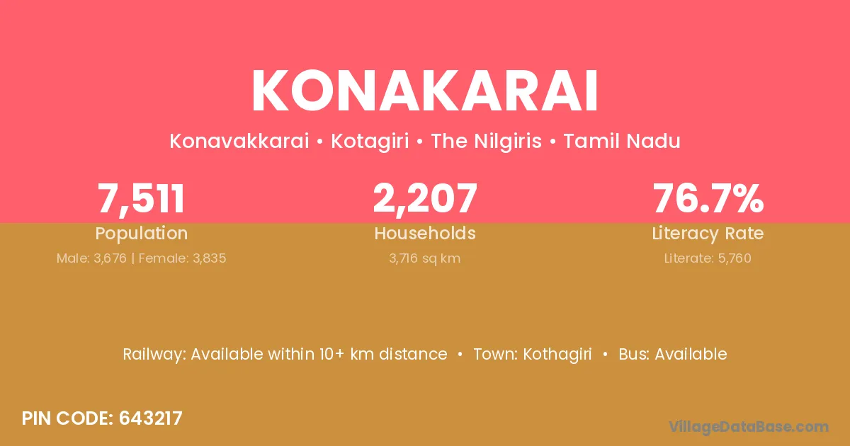 Konakarai village has a total population of 7,511 people, of which 3,676 are males and 3,835 are females.