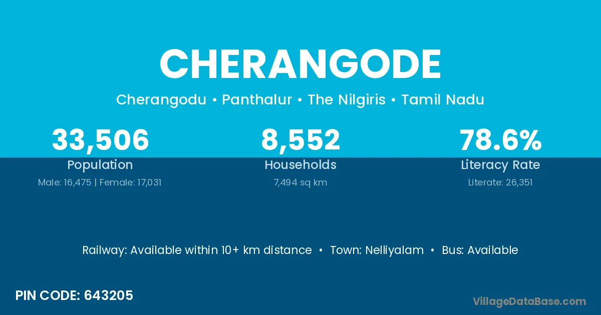 Cherangode village has a total population of 33,506 people, of which 16,475 are males and 17,031 are females.