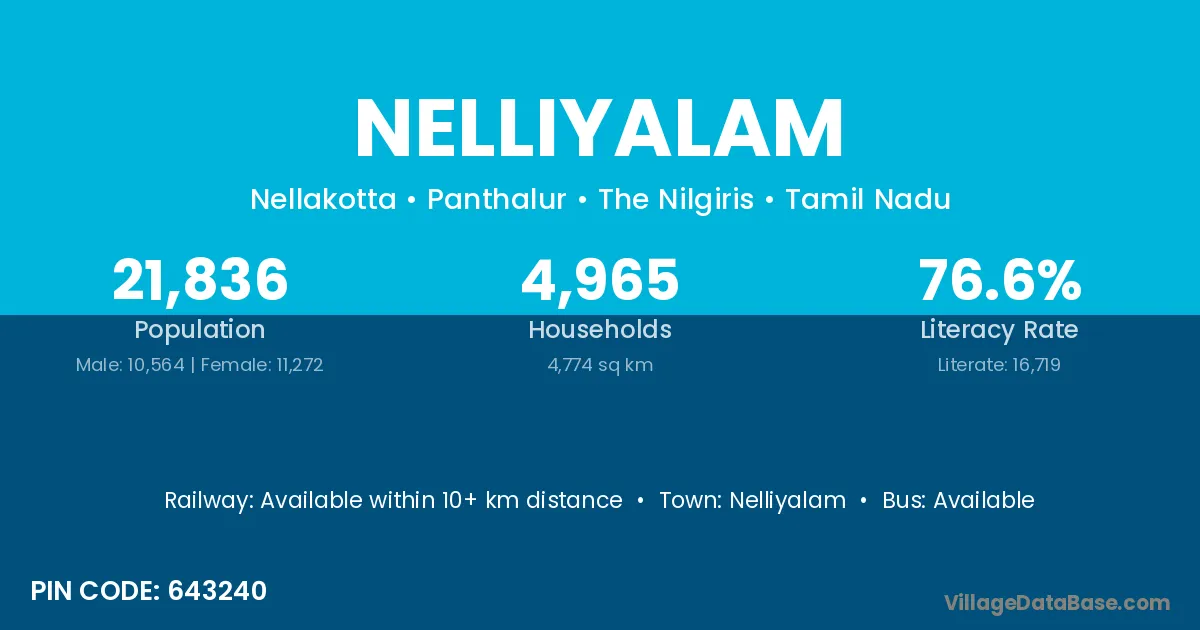 Nelliyalam village has a total population of 21,836 people, of which 10,564 are males and 11,272 are females.