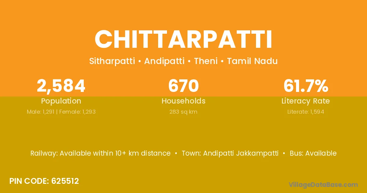 Chittarpatti village has a total population of 2,584 people, of which 1,291 are males and 1,293 are females.