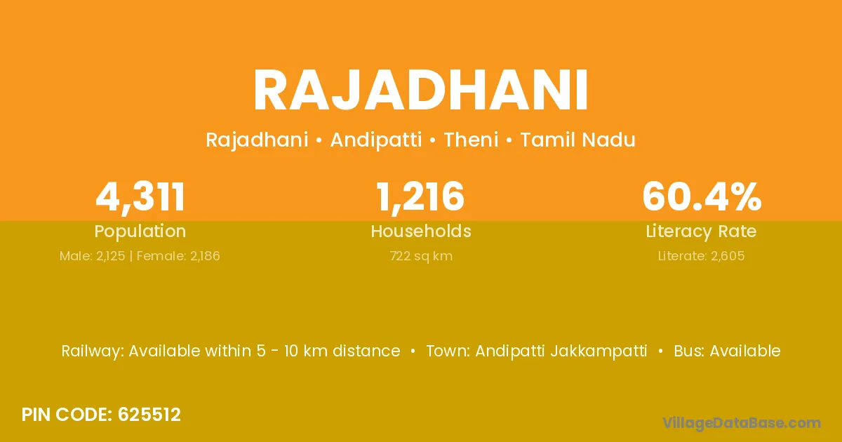 Andipatti Jakkampatti is the nearest town to Rajadhani village for major economic activities