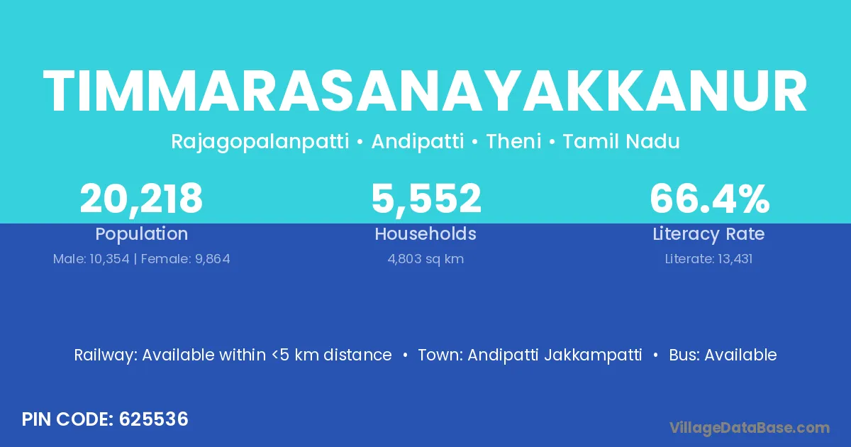 Timmarasanayakkanur village has a total population of 20,218 people, of which 10,354 are males and 9,864 are females.