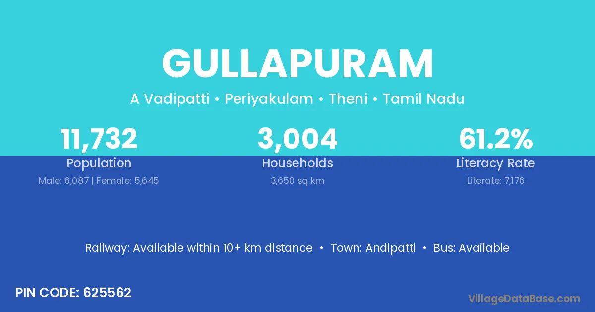 Andipatti is the nearest town to Gullapuram village for major economic activities