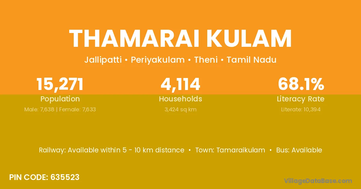 Thamarai Kulam village has a total population of 15,271 people, of which 7,638 are males and 7,633 are females.