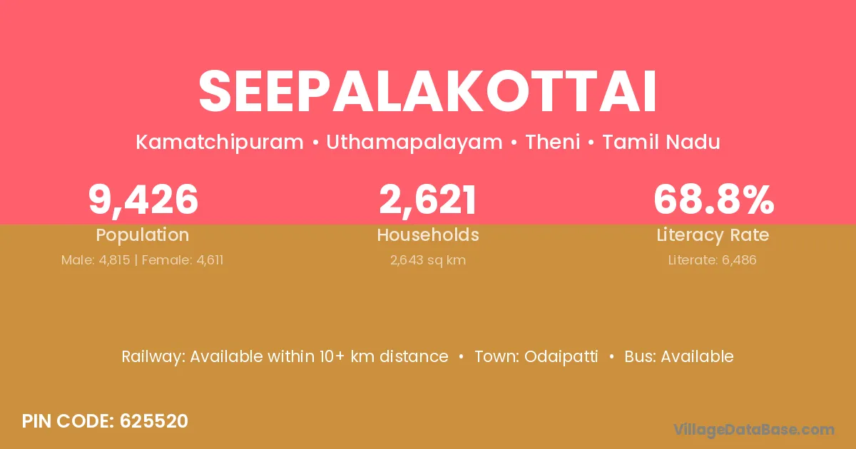 Seepalakottai village has a total population of 9,426 people, of which 4,815 are males and 4,611 are females.