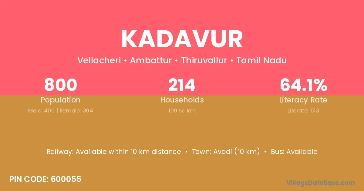 Avadi (10 km) is the nearest town to Kadavur village for major economic activities and is located approximately 10 km away.
