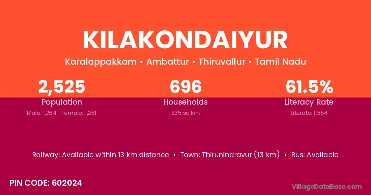 Thirunindravur (13 km) is the nearest town to Kilakondaiyur village for major economic activities and is located approximately 13 km away.