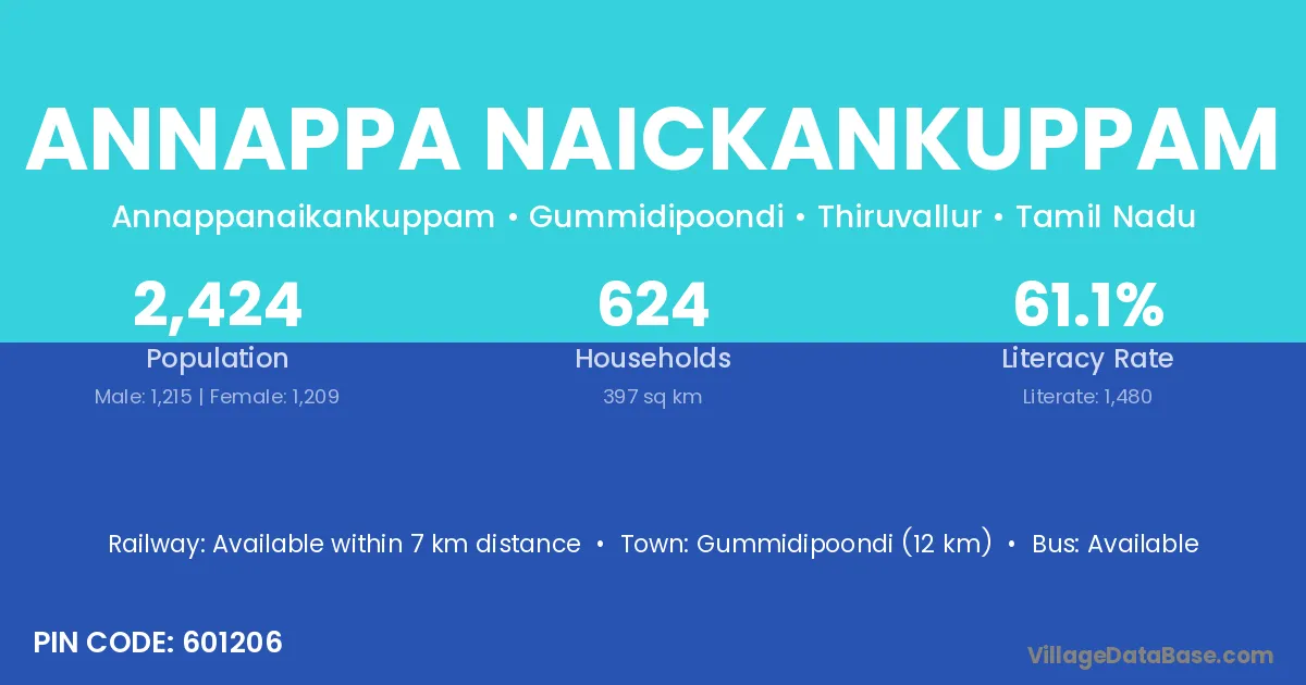 Annappa Naickankuppam village has a total population of 2,424 people, of which 1,215 are males and 1,209 are females.