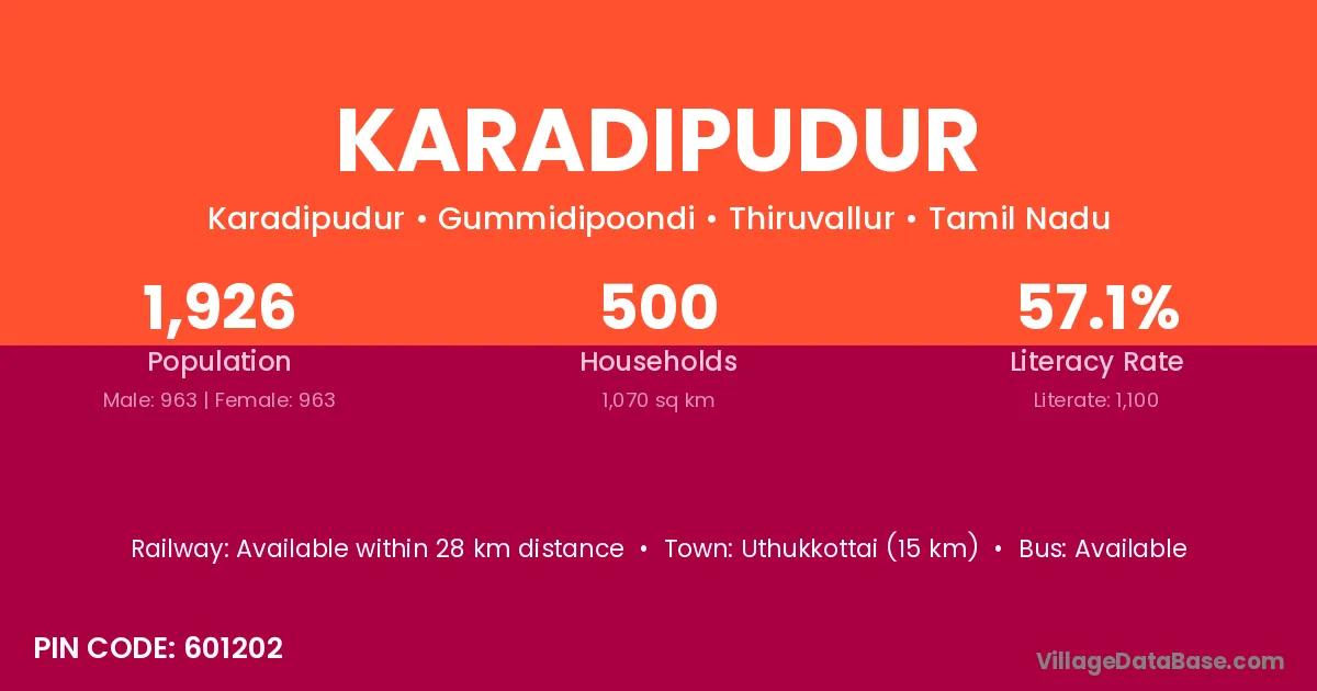 Karadipudur village has a total population of 1,926 people, of which 963 are males and 963 are females.