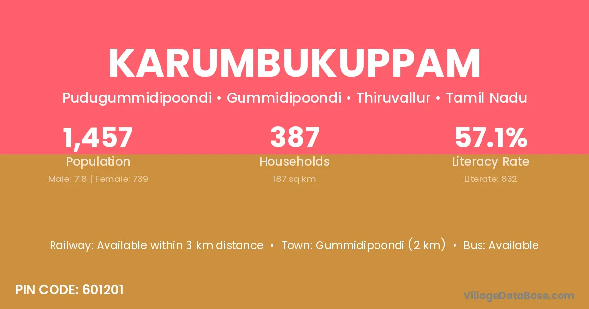 Gummidipoondi (2 km) is the nearest town to Karumbukuppam village for major economic activities and is located approximately 2 km away.