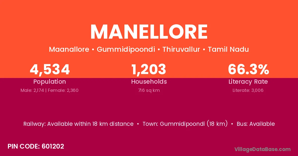 Gummidipoondi (18 km) is the nearest town to Manellore village for major economic activities and is located approximately 18 km away.