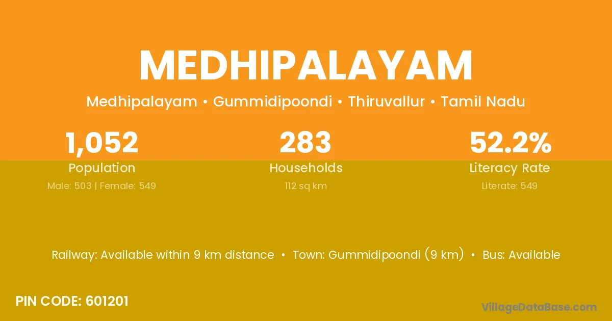 Gummidipoondi (9 km) is the nearest town to Medhipalayam village for major economic activities and is located approximately 9 km away.