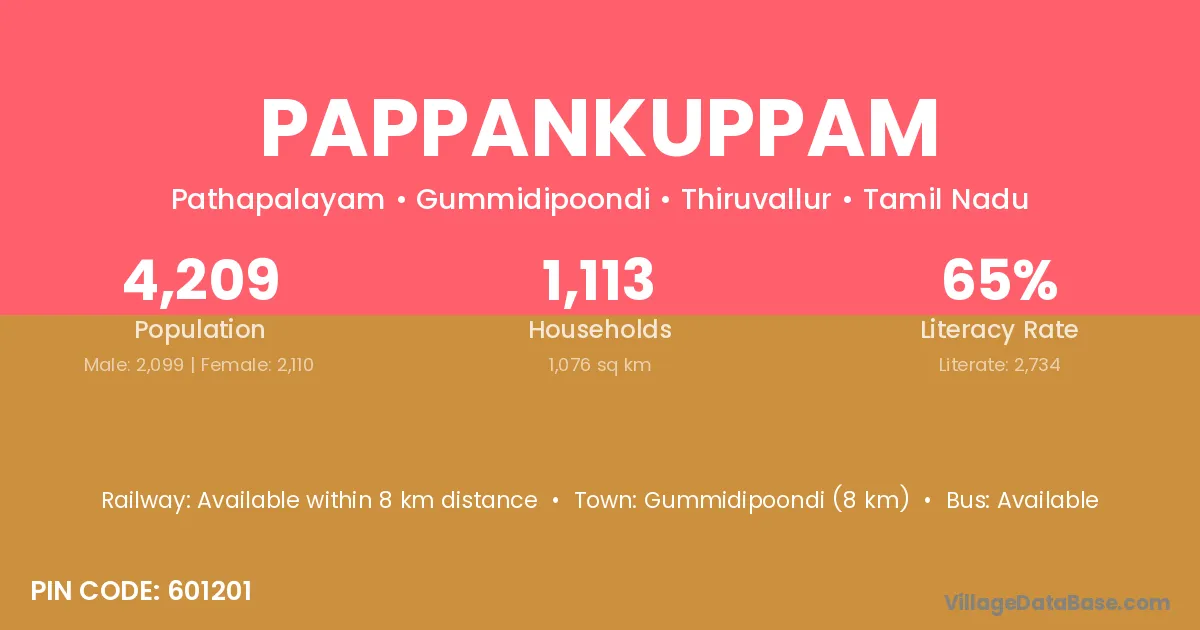 Gummidipoondi (8 km) is the nearest town to Pappankuppam village for major economic activities and is located approximately 8 km away.