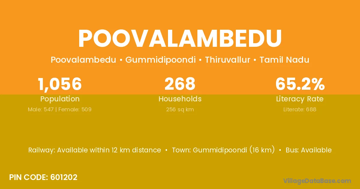 Gummidipoondi (16 km) is the nearest town to Poovalambedu village for major economic activities and is located approximately 16 km away.