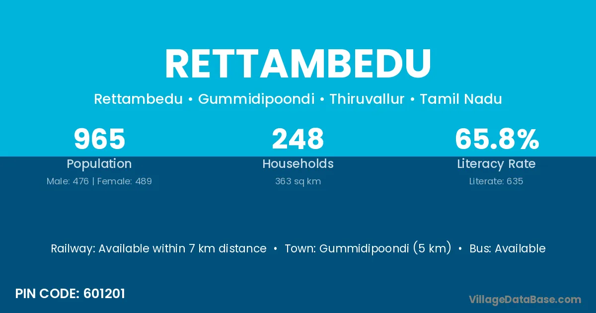 Gummidipoondi (5 km) is the nearest town to Rettambedu village for major economic activities and is located approximately 5 km away.