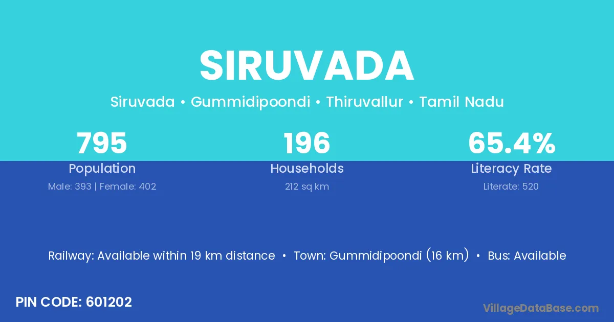Gummidipoondi (16 km) is the nearest town to Siruvada village for major economic activities and is located approximately 16 km away.