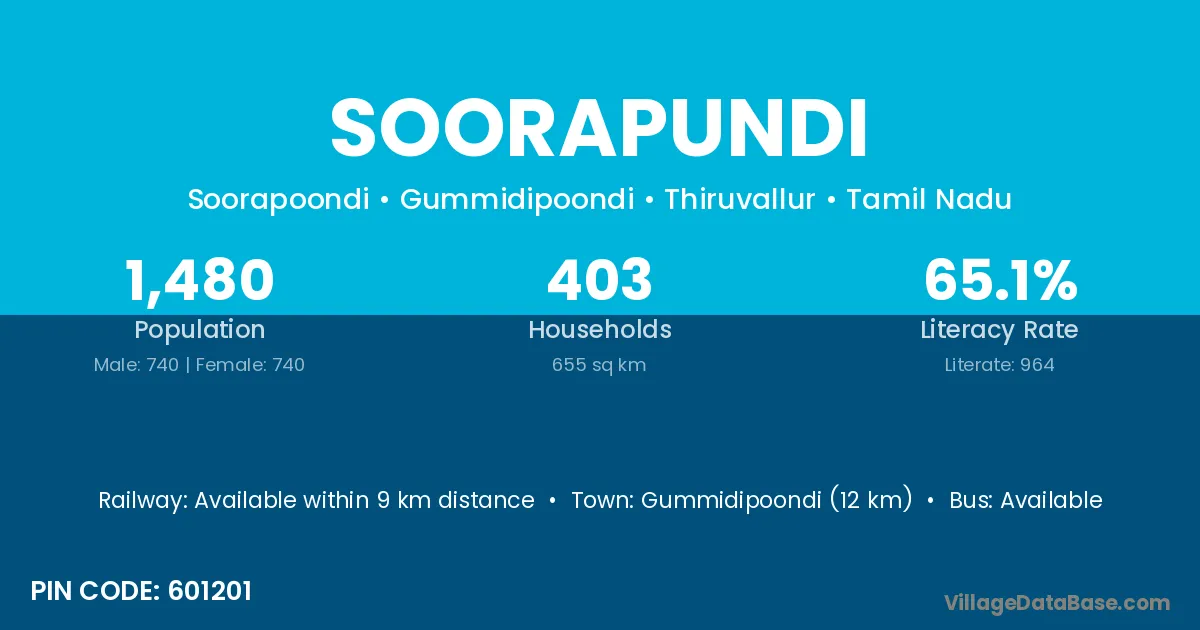Gummidipoondi (12 km) is the nearest town to Soorapundi village for major economic activities and is located approximately 12 km away.
