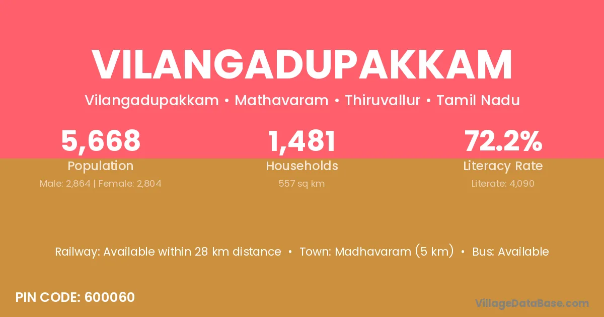Madhavaram (5 km) is the nearest town to Vilangadupakkam village for major economic activities and is located approximately 5 km away.