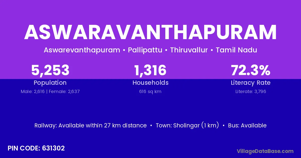 Sholingar (1 km) is the nearest town to Aswaravanthapuram village for major economic activities and is located approximately 1 km away.