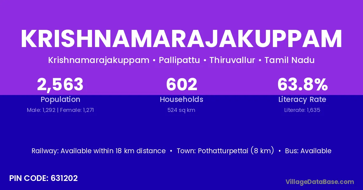 Krishnamarajakuppam village has a total population of 2,563 people, of which 1,292 are males and 1,271 are females.