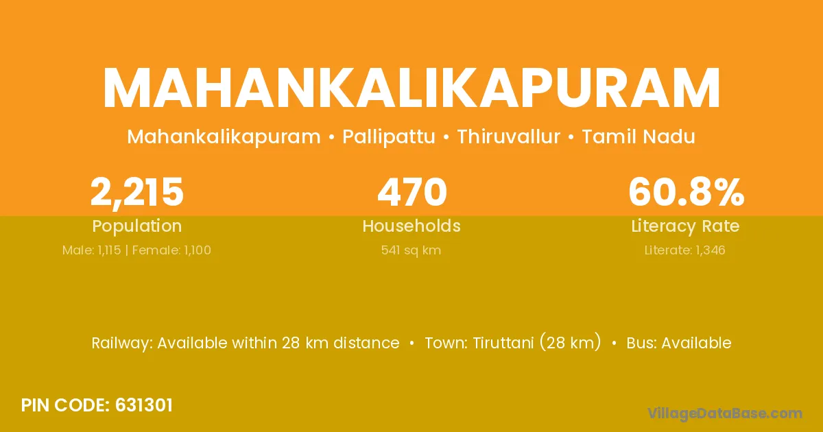 Tiruttani (28 km) is the nearest town to Mahankalikapuram village for major economic activities and is located approximately 28 km away.