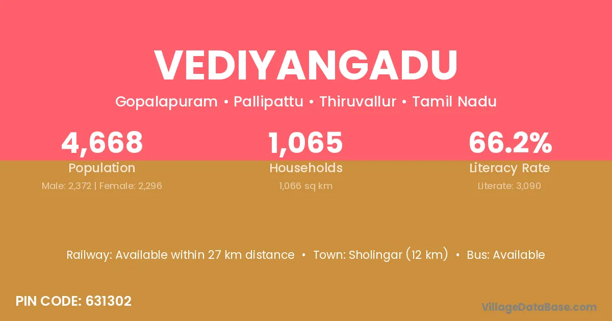 Sholingar (12 km) is the nearest town to Vediyangadu village for major economic activities and is located approximately 12 km away.
