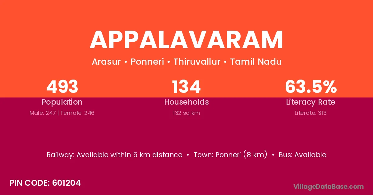 Ponneri (8 km) is the nearest town to Appalavaram village for major economic activities and is located approximately 8 km away.