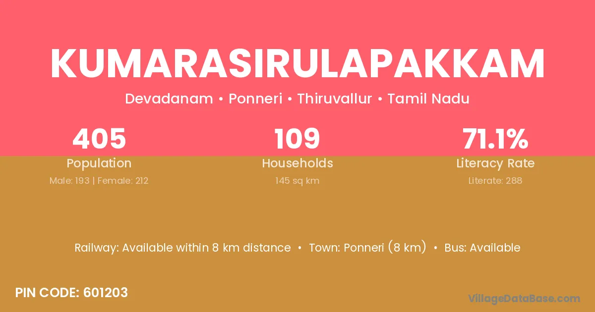 Kumarasirulapakkam village has a total population of 405 people, of which 193 are males and 212 are females.
