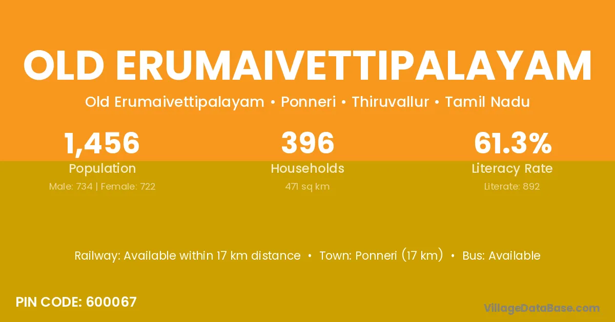 Ponneri (17 km) is the nearest town to Old Erumaivettipalayam village for major economic activities and is located approximately 17 km away.