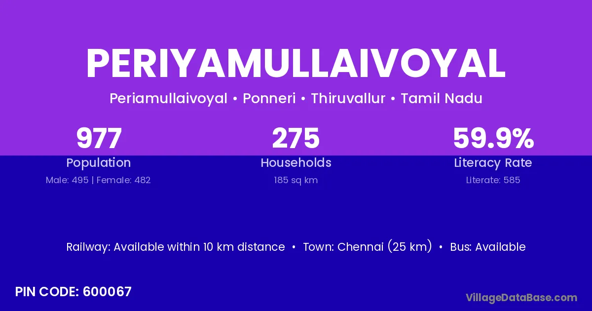 Chennai (25 km) is the nearest town to Periyamullaivoyal village for major economic activities and is located approximately 25 km away.