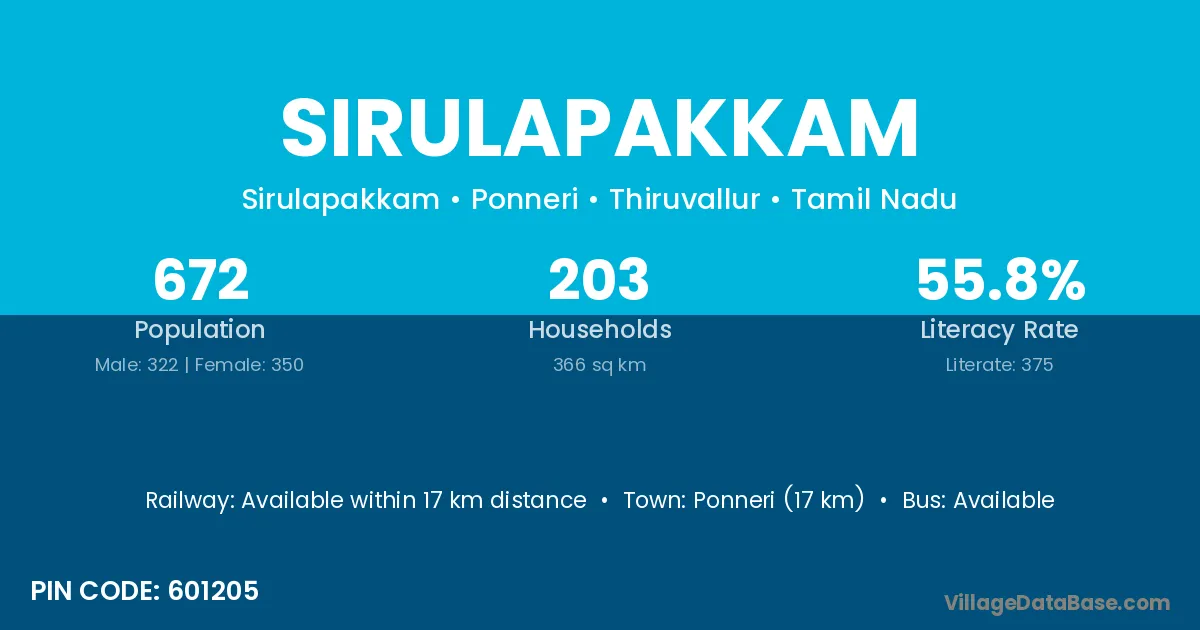 Ponneri (17 km) is the nearest town to Sirulapakkam village for major economic activities and is located approximately 17 km away.