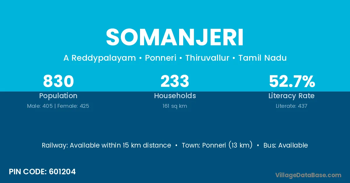 Ponneri (13 km) is the nearest town to Somanjeri village for major economic activities and is located approximately 13 km away.
